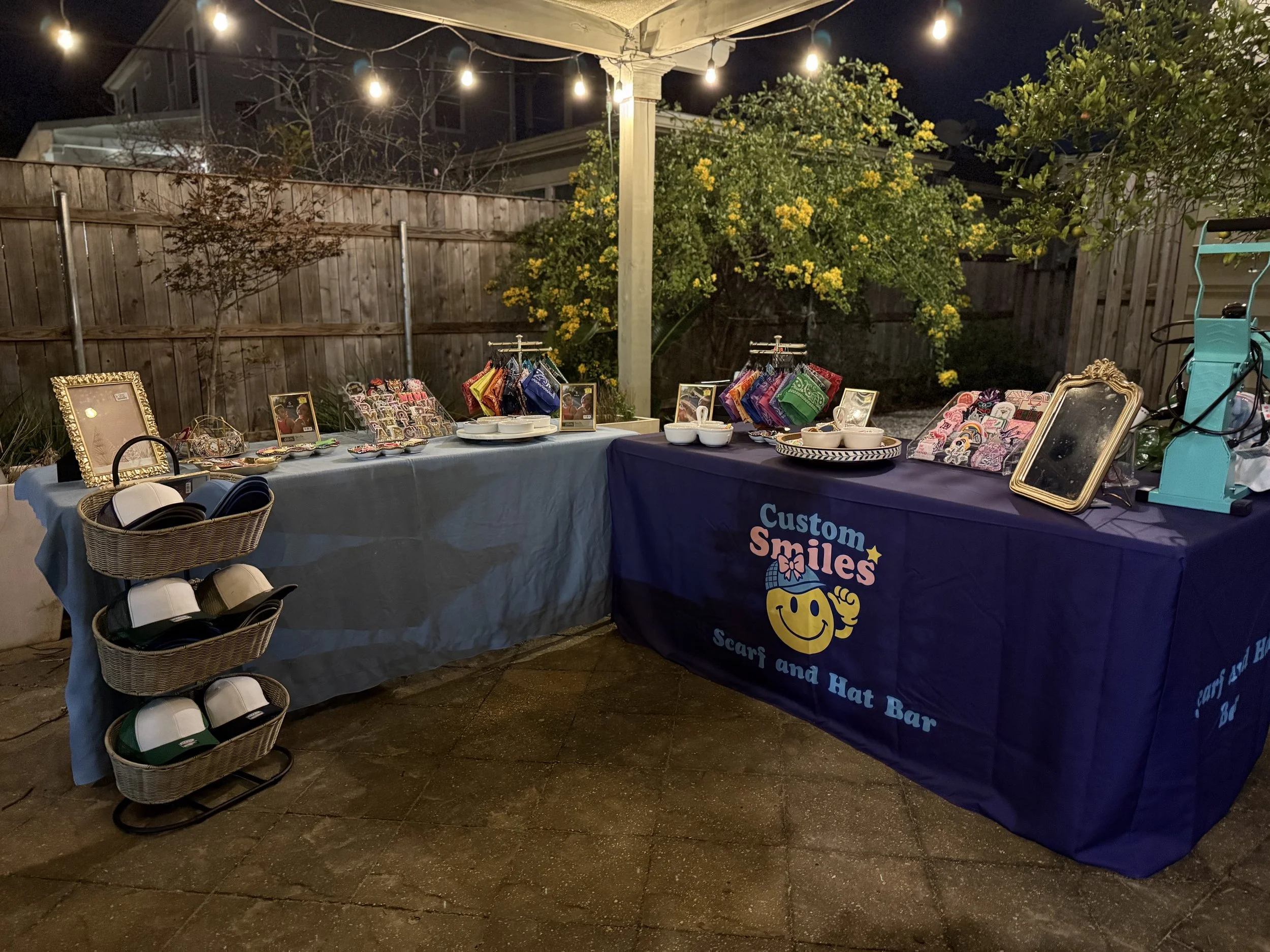 Your Party. Your Style. Your Smile. Custom Smile Hat Bar turns any party into an unforgettable experience. With patches, bling, and endless creativity, your guests design hats that show off their style — and keep the good vibes going long after the event. Click here to check out pricing